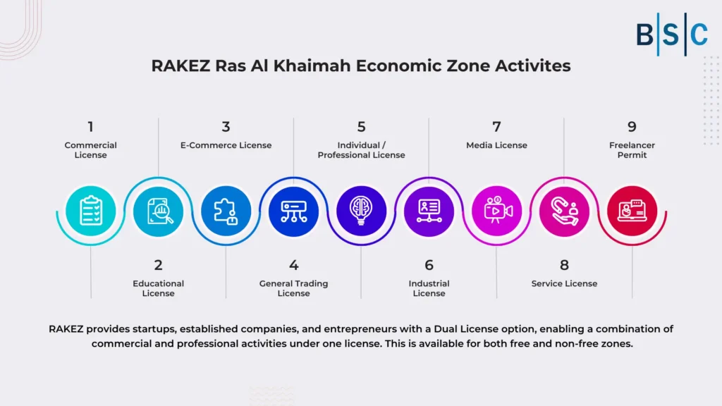 RAKEZ provides startups, established companies, and entrepreneurs with a Dual License option, enabling a combination of commercial and professional activities under one license. This is available for both free and non-free zones.