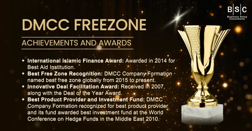 DMCC has received several awards, including the International Islamic Finance Award for Best Aid Institution in 2014 and being named the best free zone in the world for multiple years. It has also received awards for innovation and excellence in deal facilitation and financial products.
